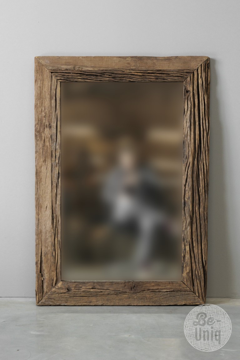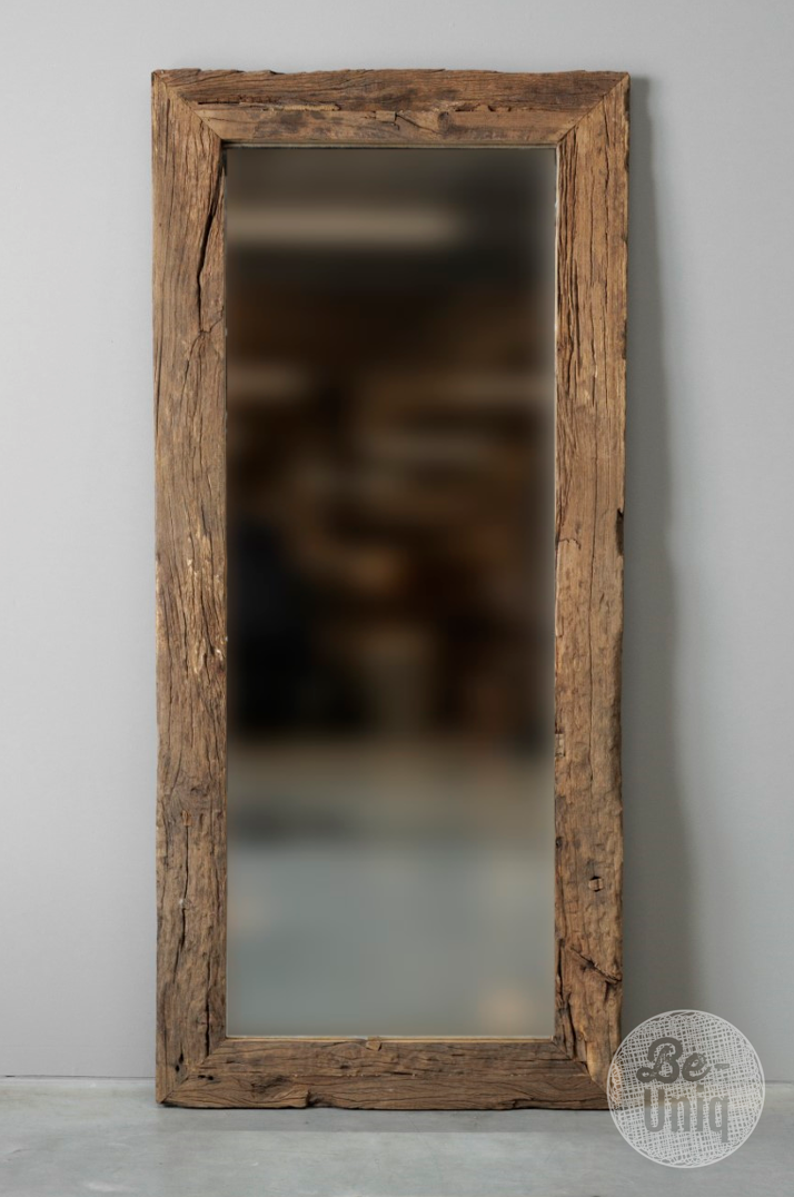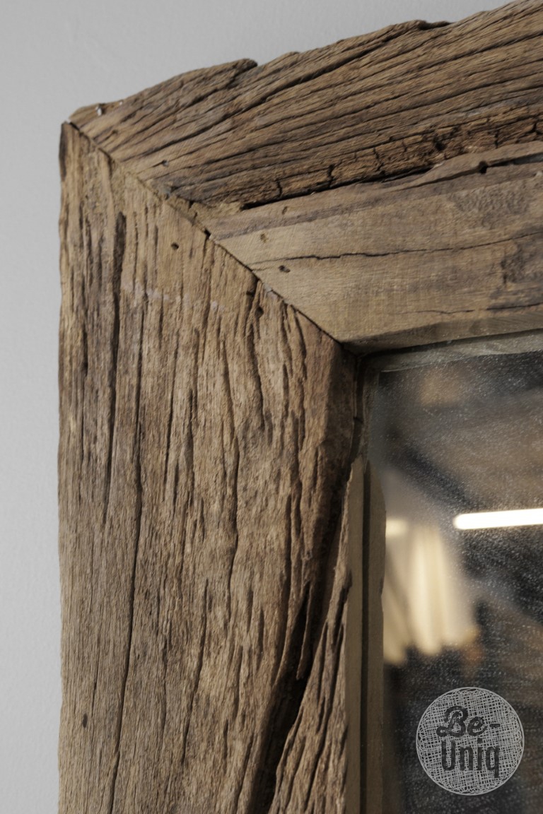 Unieke spiegel van oud truck-hout met een horizontaal en verticaal ophangsysteem.