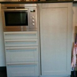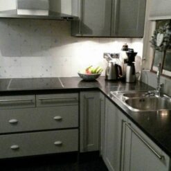 Hier een voorbeeld van een keuken van een klantje van ons. Haar kastdeurtjes waren vanille geel en die heeft ze geverfd in de kleur Paris Grey van Annie Sloan.